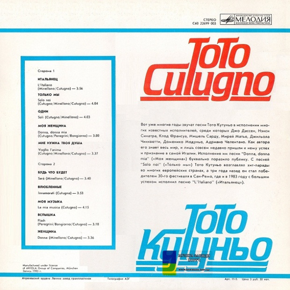 Багато років поспіль пісні Toto Cutugno звучать у виконанні Джо Дассена, Ненсі Сінатри, Клода Франсуа, Мішеля Сарду, Мірей Матьє, Адріано Челентано та інших виконавців. Як автора і чудового мелодиста його знає весь світ, і лише на початку 80-х він наважився заспівати свою «Donna, Donna Mia». Публіка була вражена його виконавчими даними, і вже у 1983 році він став переможцем найвідомішого та фестивалю Італії в Сан-Ремо з піснею «L'Italiano». Назва пісні послужила назвою альбому, який був також випущений фірмою «Мелодія» у Радянському Союзі на плативці «Тото Кутуньо Итальянец». Стан конверту та платівки ідеальні.