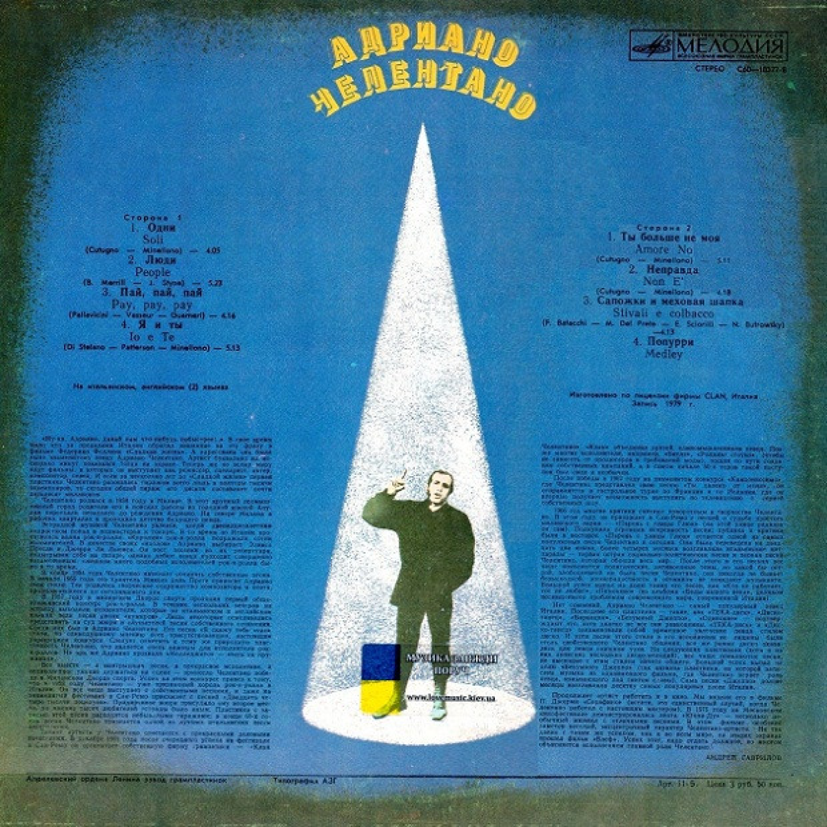 Adriano Celentano став кумиром мільйонів. У всьому світі йдуть фільми, в яких він виступає режисером, сценаристом, актором, композитором та співаком. І якщо кілька років до картини «Солодке життя» перша платівка Челентано розійшлася накладом всього у півтори тисячі екземплярів, то зараз загальний тираж його альбомів складає майже понад 50 мільйонів. Немає сумнівів, що Адріано Челентано найпопулярніший співак Італії, а його велика дискографія підтверджує це. Стан конверту та платівки «Адріано Челентано Одні» ідеальні.