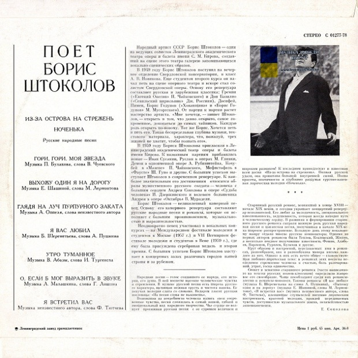 Народний артист СРСР Борис Штоколов був одним із провідних солістів Ленінградського академічного театру опери та балету імені С. М. Кірова. Він створив на сцені цього театру велику галерею яскравих вокальних образів. Основу його репертуару складає російська та зарубіжна класика, народні пісні та романси, які він виконує з великим проникненням, музичністю та виразністю. З великим успіхом Борис Штоколов виступав у різних пристижних залах країни та за кордоном. На платівці «Русские песни и романсы» представлені старовинні романси та народні пісні, які захоплюють ліричним настроєм, красою мелодії, щирістю почуттів та приємним акомпанементом. Стан конверту та платівки ідеальні.