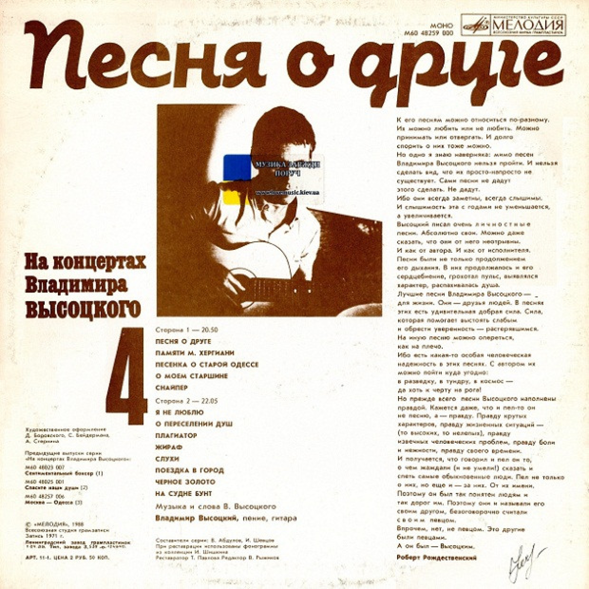 Чим швидше коні, тим довша дорога, що залишається позаду. Нам здається, що ми стрімко мчимося у майбутнє, але туди ще треба дістатися. Володимир Висоцький за свої 42 роки прожив інтенсивне життя. За старими мірками він пережив кілька століть. Як це не парадоксально, Володимир Висоцький якимись частинками нагадує всіяких великих майстрів, і кожен майстер неповторний. Такі відчайдушні люди з'являються час від часу. Вони своїм баченням світу збагачують нас не тільки духовно, а й вказують напрямок, у якому треба рухатися вперед у майбутнє. До його пісень можна відноситися по-різному. Їх можна любити чи не любити, можна приймати чи відкидати. Але одне напевно – повз пісні Висоцького не можна пройти і зробити вигляд, що їх немає. До вашої уваги сьома платівка «Владимир Высоцкий Песня о друге» із серії «На концертах Владимира Высоцкого». Стан конверту та платівки ідеальні.