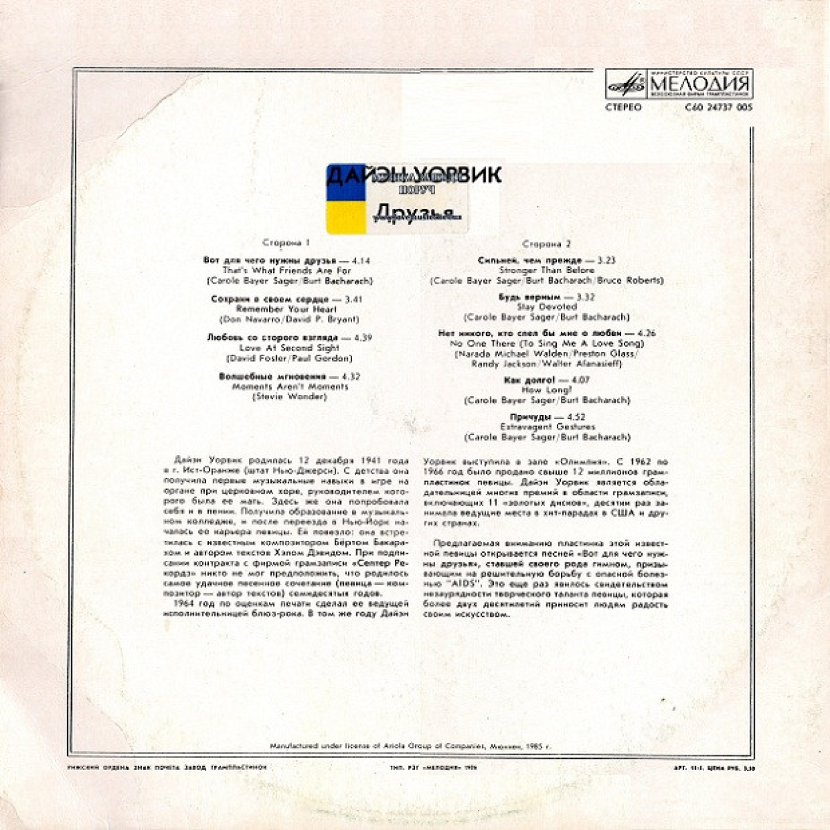 З 1962 по 1966 рік було продано понад 12 мільйонів платівок Даєни Уорвік. Вона володарка багатьох премій у музичній індустрії, що містять 11 «золотих» дисків. Також співачка десятки разів займала провідні місця у хіт-парадах у США та інших країнах. За оцінками преси 1964 рік зробив Dionne Warwick провідною виконавицею блюз-року. До вашої уваги альбом 1986 року «Дайэн Уорвик Друзья». Конверт має затертість і відбиток від платівки. Прим'яті два кути. Стан платівки ідеальний.