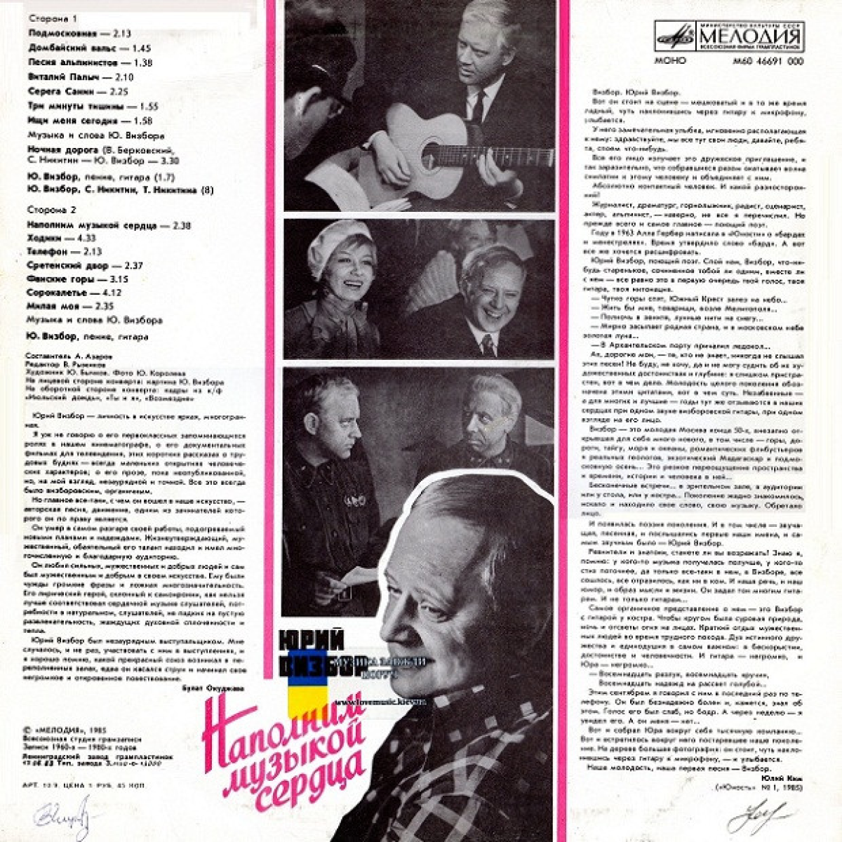 Юрій Візбор особистість у мистецтві яскрава та багатогранна. Згадаємо про його першокласні ролі в кіно, про його документальні фільми для телебачення, цих коротких розповідей про трудові будні звичайної людини (це завжди маленькі відкриття людських характерів), а ще згадаємо про його неабияку і точну прозу. Але головне з чим він увійшов до нашого життя – жанр авторської пісні. Юрій Візбор ввжається одним із засновків (основоположників) жанру. Його талант знаходив і має численну та вдячну аудиторію. До вашої уваги платівка «Юрий Визбор Наполним музыкой сердца». Стан конверту ідеальний. Стан платівки задовільний (на другій стороні є невелика подряпина на дві пісні).