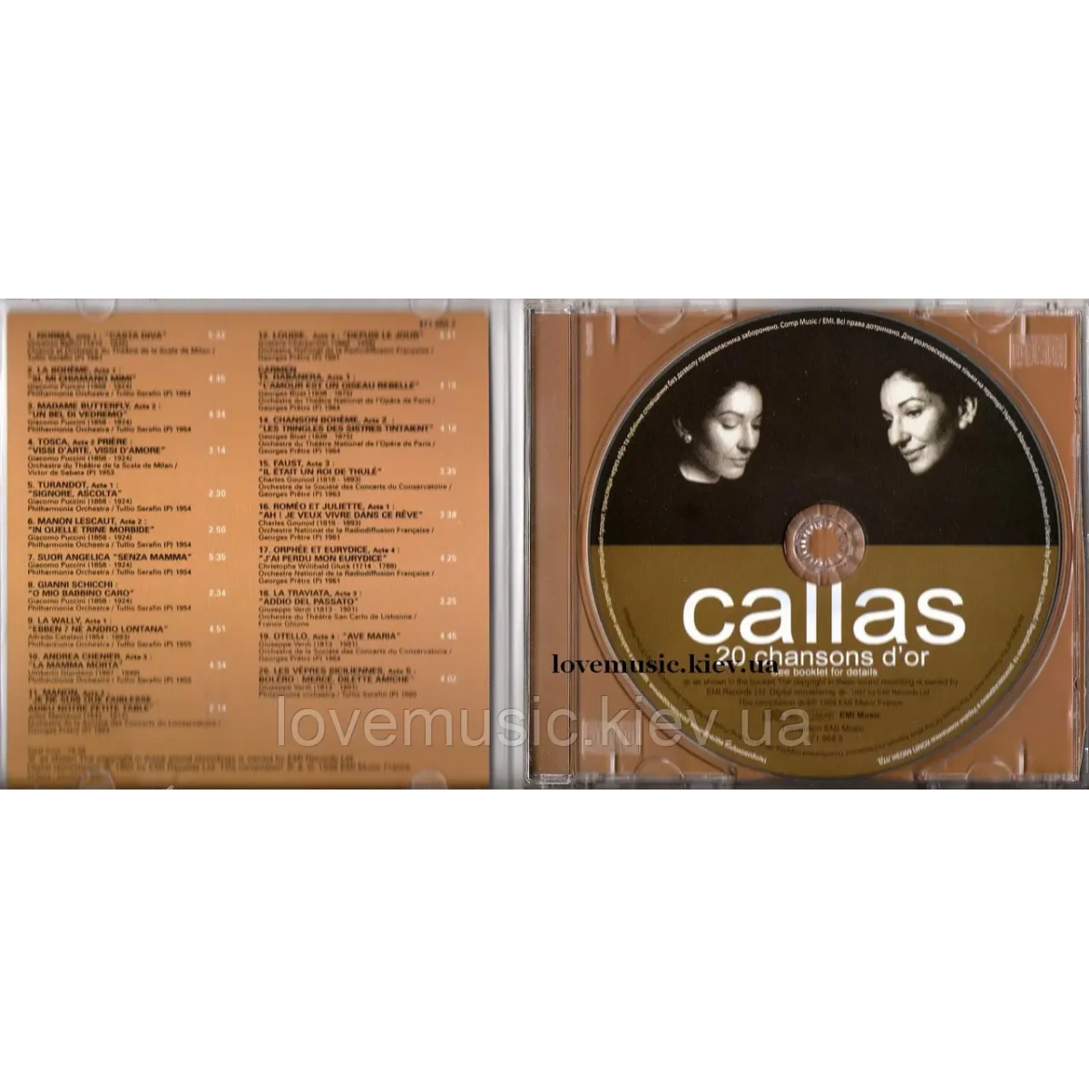 Американська співачка грецького походження Maria Callas стала однією з найбільших оперних співачок 20 століття. На початку кар'єри вона почала виступати більше, як драматична колоратура, трохи пізніше, як лірико-драматичне сопрано, а останніми роками життя почала виконувати партії мецо-сопрано. Яскравістю співу та гри вона справила революцію на оперній сцені, перетворивши на серйозну драму те, що зазвичай розумілося, як нудна оперна рутина. Maria Callas не обмежувалася віртуозними колоратурами в операх Белліні, Россіні та Доніцетті, а перетворила свій голос на головний виразний засіб. Вона була введена до Зали слави журналу «Gramophone», як одна з найяскравіших співачок усіх часів. Померла Марія Каллас у 1977 році в Парижі. До вашої уваги пропонується диск «20 chansons d'or». Збірка містить 20 вражаючих пісень у виконанні цієї видатної співачки.