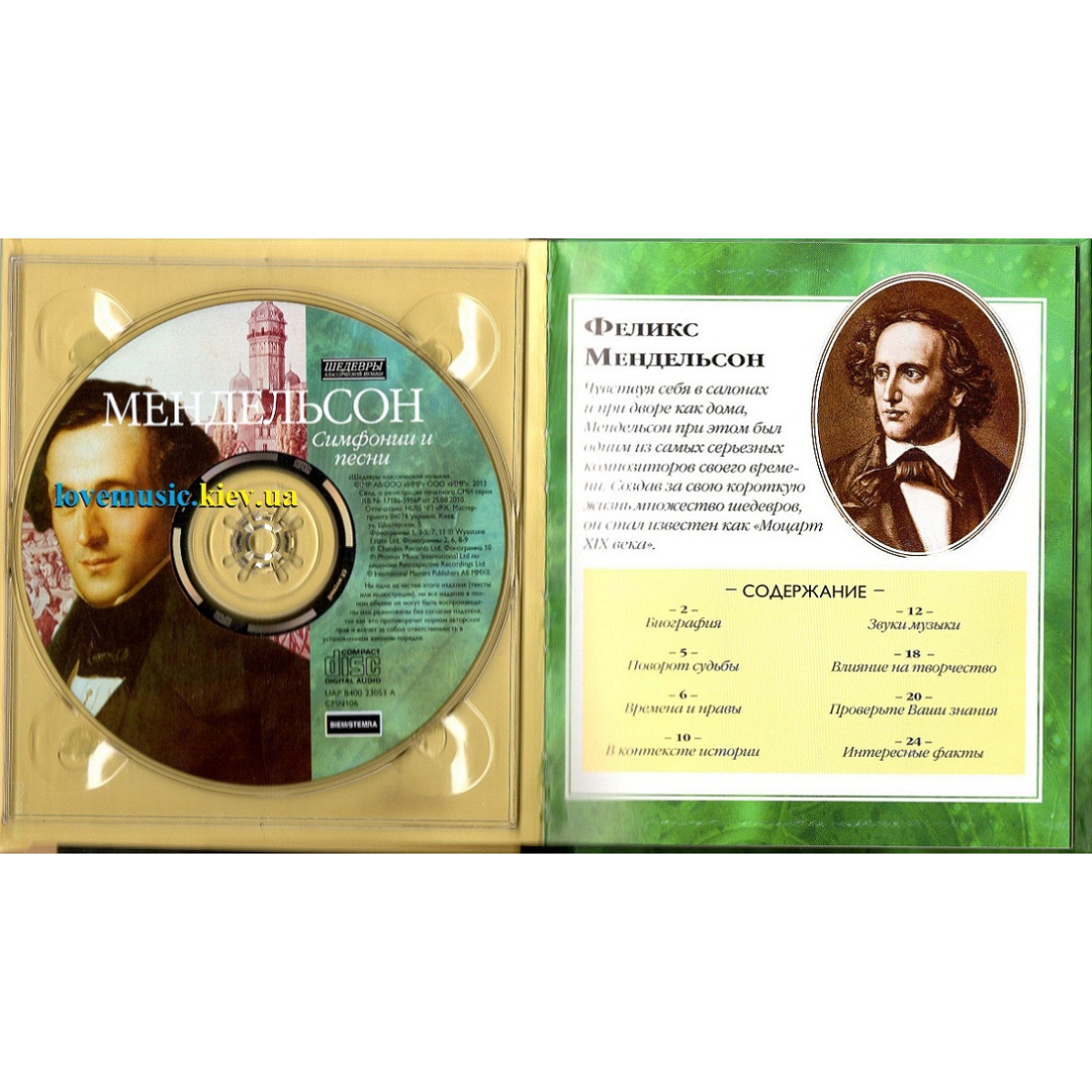 Музичний диск «Мендельсон. Симфонии и песни» із серії «Шедеври класичної музики» представляє видатного композитора Фелікса Мендельсона, різноманітна діяльність якого підпорядкована найблагороднішим і найсерйознішим цілям. Вона сприяла піднесенню музичного життя Німеччини, зміцненню її національних традицій, вихованню освіченої публіки та освічених професіоналів. Мендельсона залучали різні жанри, форми та виконавські засоби. З рівною майстерністю він писав для симфонічного оркестру і фортепіано, хору і органу, камерного ансамблю і голосу, виявляючи справжню універсальність обдарування та найвищий професіоналізм.