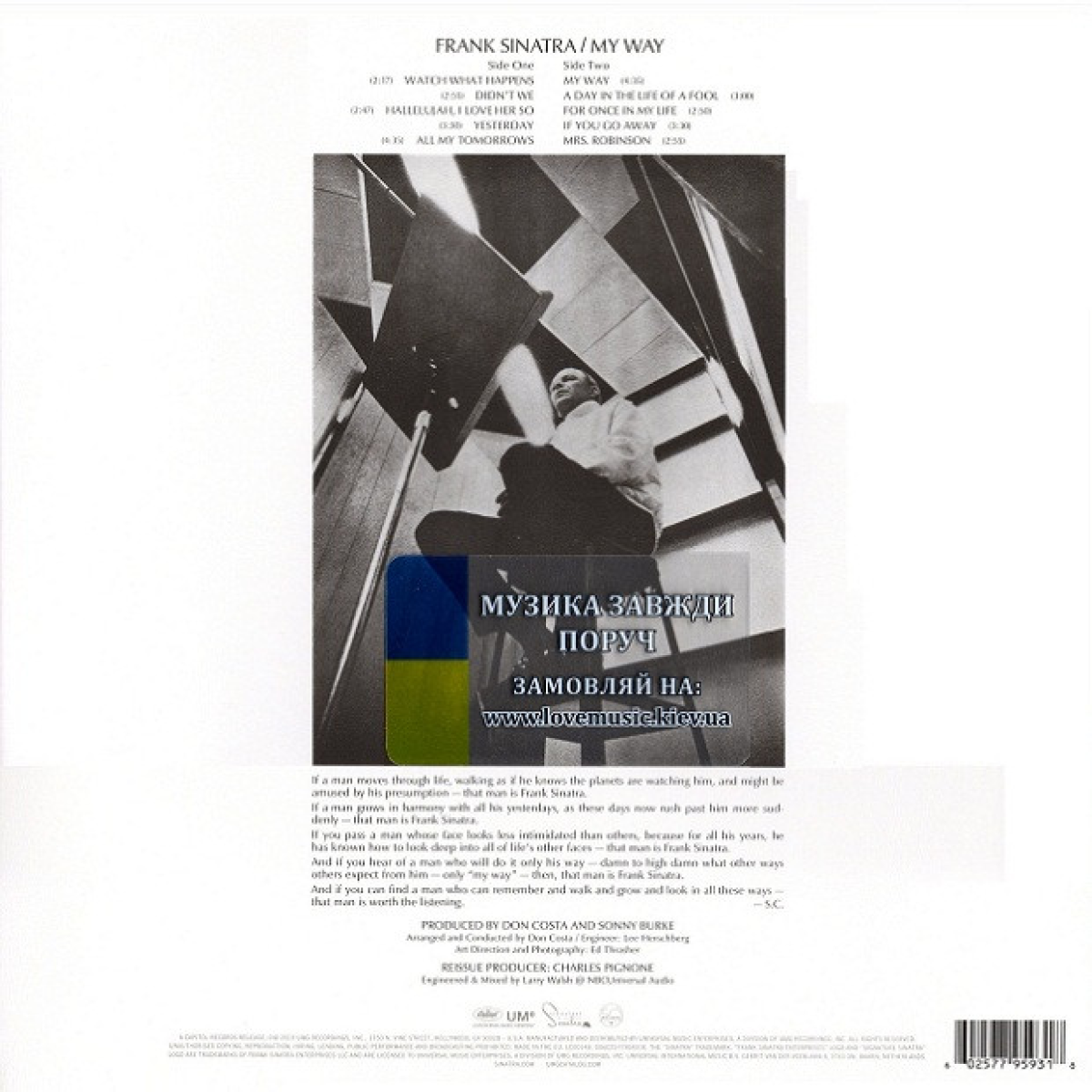 Перевидання альбому Френка Сінатри «My way» у 2019 році відзначає 50-річчя однієї із найзнакових записів усіх часів. До альбому, крім відомого хіта, увійшла пісня «All My Tomorrows» з фільму «A Hole In The Head», в якому Frank Sinatra зіграв головну роль. На момент запису платівки голос Синатри перетворився на приємний теплий баритон, який мав якусь гіпнотичну дію. Це був час, коли Сінатра відкрився у всьому своєму потенціалі справжнього кумира мільйонів. Також потрібно віддати належне продюсеру та аранжувальнику Дону Коста, який допоміг Френку Сінатрі адаптувати класичні пісні платівки до блиску музичного та вокального мистецтва. Платівка запечатана в оригінальну вакумну упаковку (SS / Still Sealed).