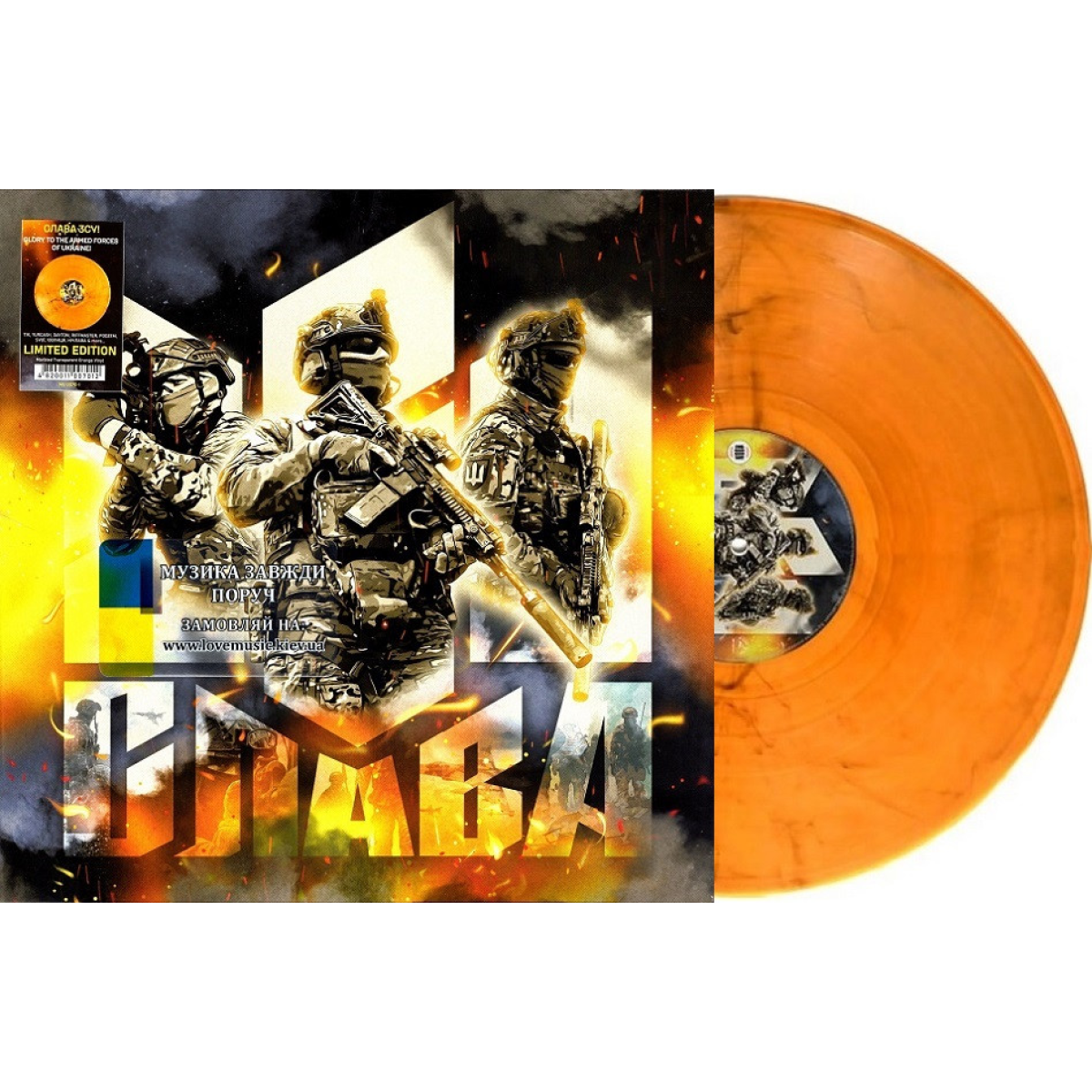 Вінілова платівка «Слава ЗСУ» не просто збірка музичних пісень. Це бойовий марш серця українського народу, присвячений тим, хто щодня виборює свободу, захищає рідну землю та пише новітню історію стійкості й мужності. Кожна нота звучить як гімн воїнам світла, а кожне слово як клятва вірності Україні. Тексти пісень проникнуті духом незламності, щирі, а деякі написані на фронтових блокпостах. Це символ сили і єдності. Їхні мелодії переплітаються з шумом бурі, і нагадують про складні шляхи боротьби, але водночас дають надію та наснагу. Платівка «Слава ЗСУ» об’єднує слухачів під одним українським прапором. Вона надихає, підтримує бойовий дух і нагадує: ми не самі, ми сильні, український народ, який ніколи не скориться. Лімітоване видання налічує 300 примірників. Жовтогарячий колір вінілу (Marbled Transparent Orange) робить його схожим на палаюче сонце. Платівка запечатана у вакуумну заводську плівку (SS / Still Sealed).